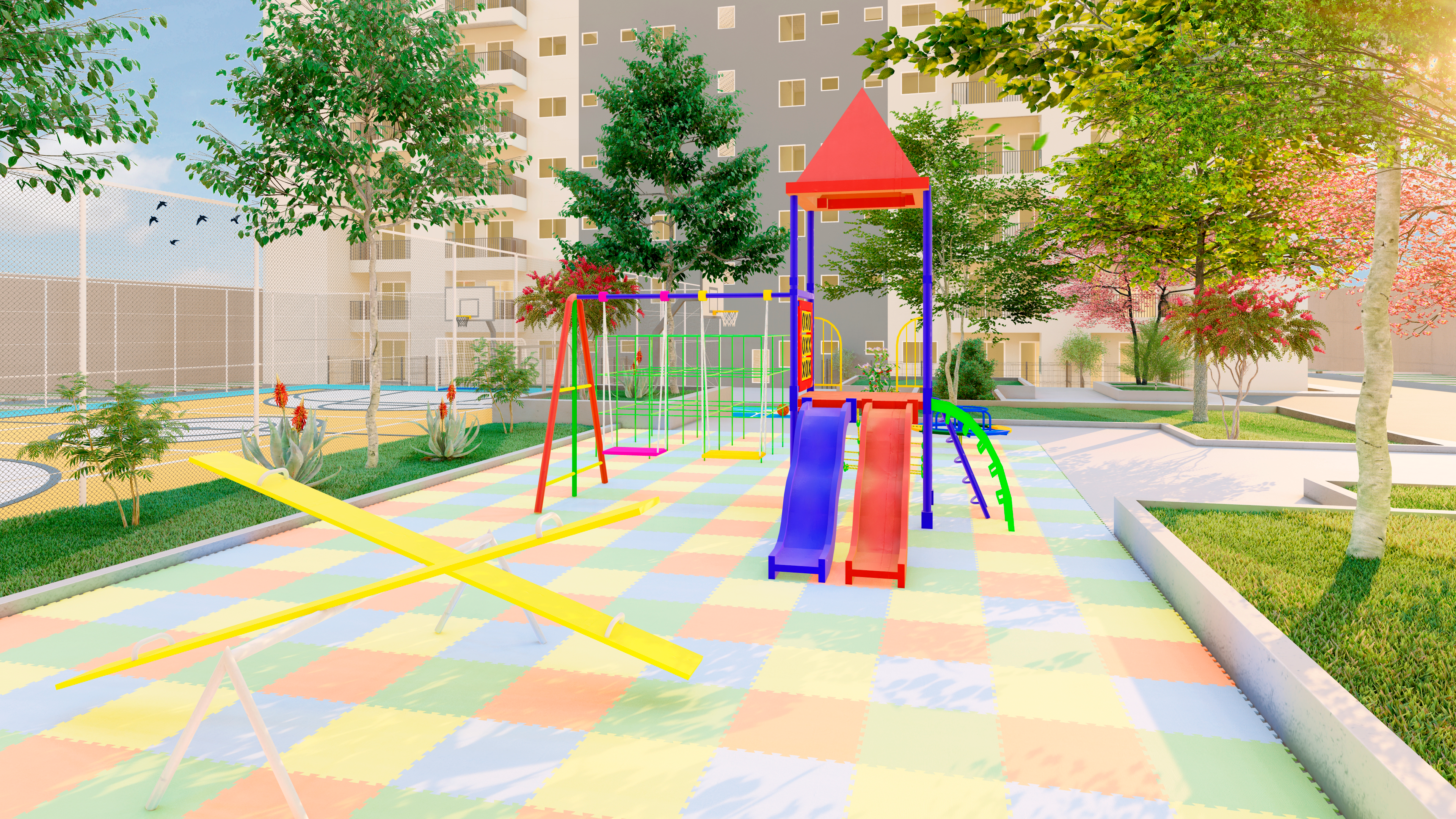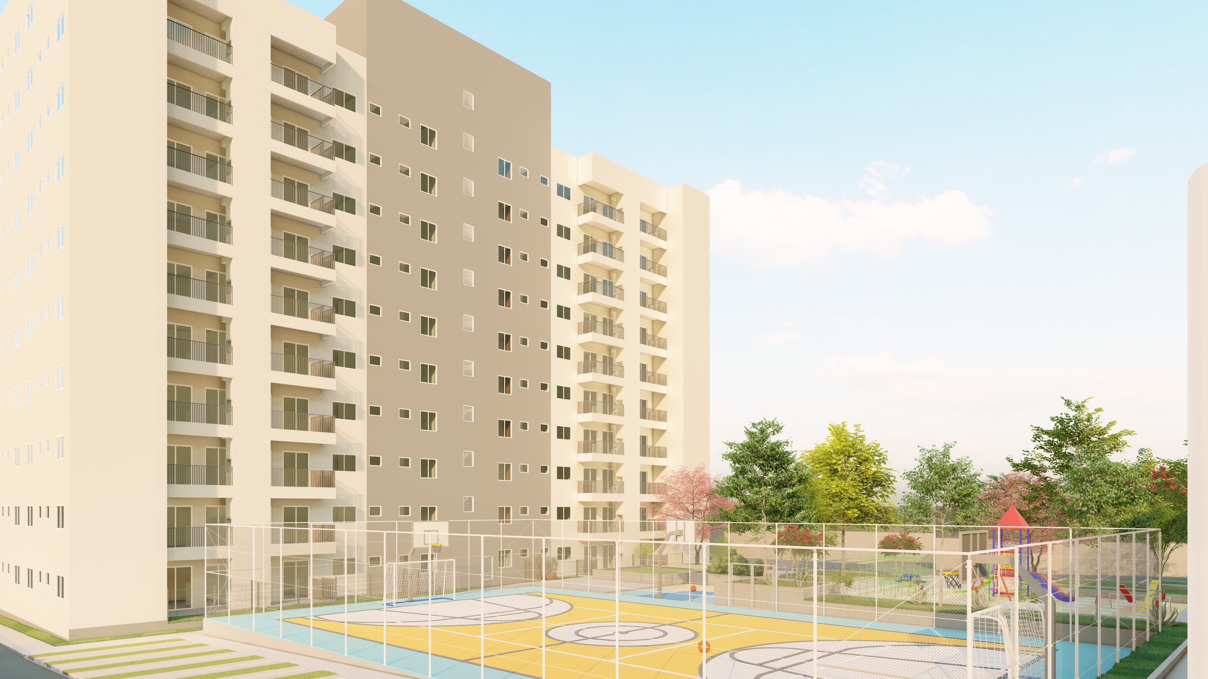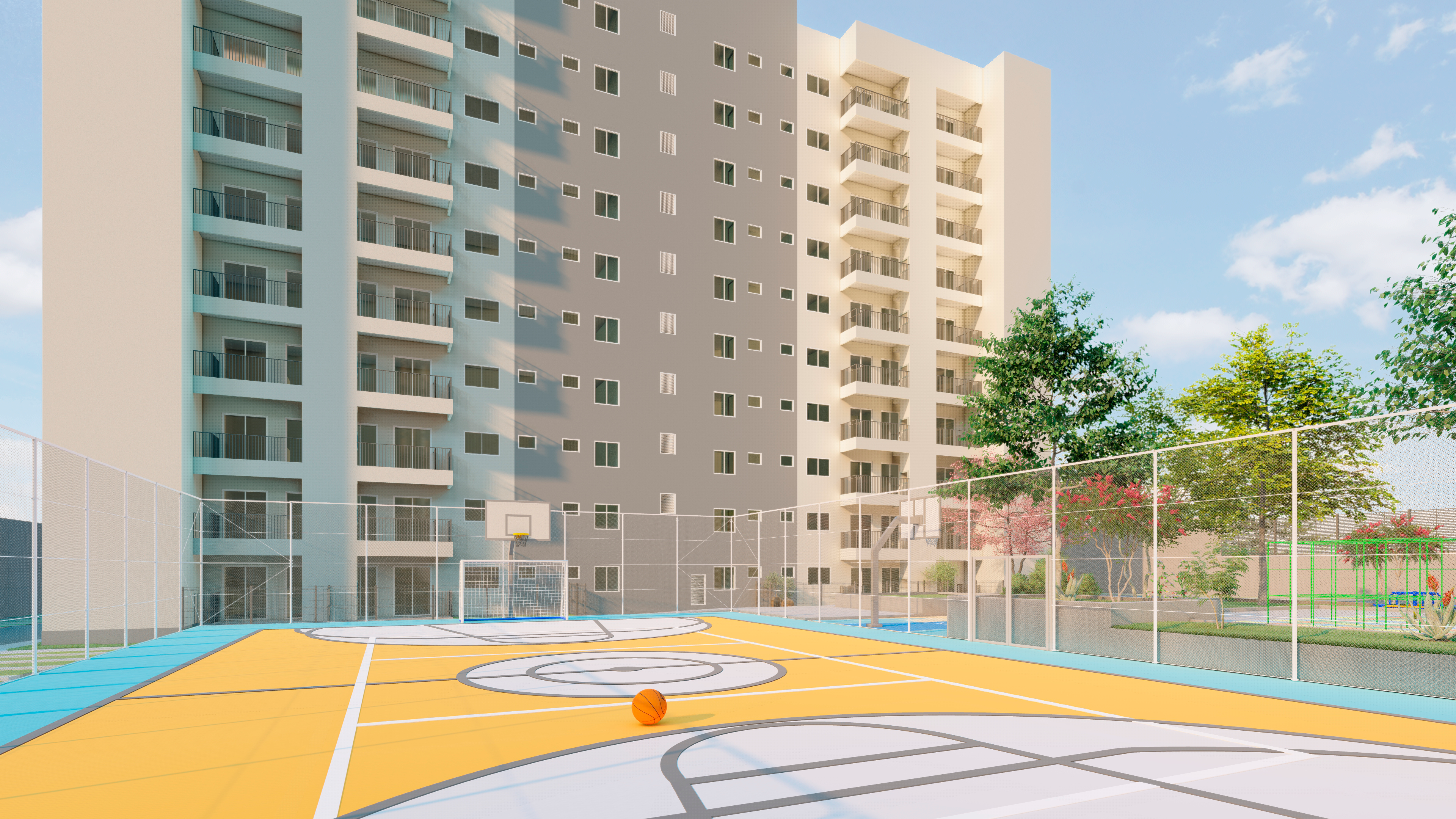 Os espaços de uso comum são um salão de festas (capacidade 180 pessoas), 4 quiosques com churrasqueira, um vestiário, uma piscina, um deck solarium, uma quadra poliesportiva (medidas oficiais), um bicicletário, um playground, uma meia quadra de basquete, uma central de GLP, um depósito de lixo, 10 vagas de estacionamento para visitantes, 1 vaga de estacionamento por apartamento.