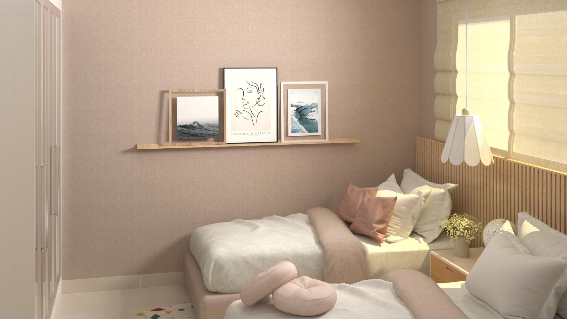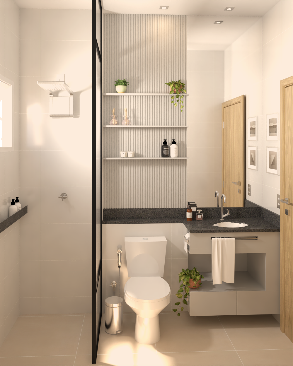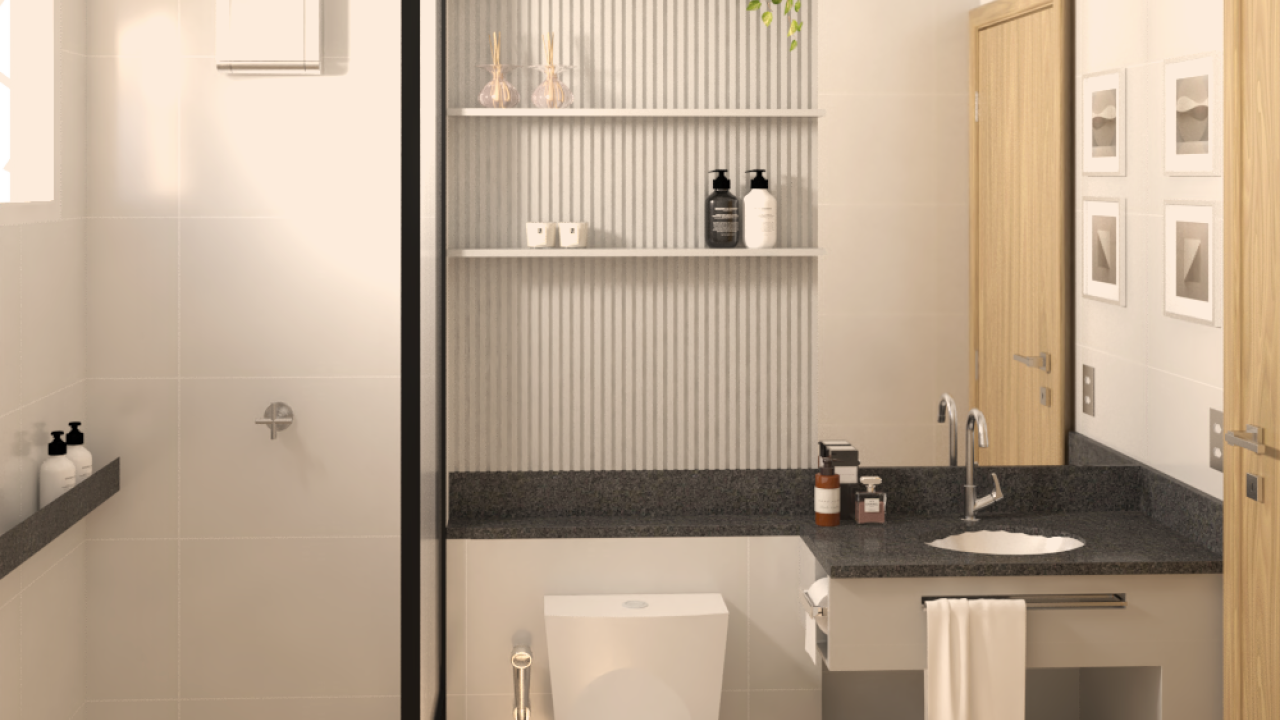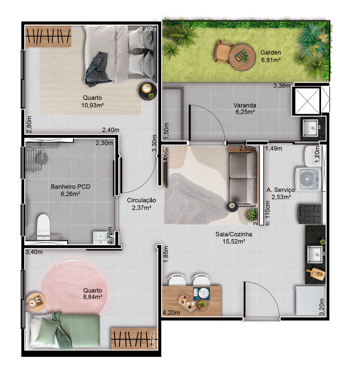 Os espaços de uso comum são um salão de festas (capacidade 180 pessoas), 4 quiosques com churrasqueira, um vestiário, uma piscina, um deck solarium, uma quadra poliesportiva (medidas oficiais), um bicicletário, um playground, uma meia quadra de basquete, uma central de GLP, um depósito de lixo, 10 vagas de estacionamento para visitantes, 1 vaga de estacionamento por apartamento.